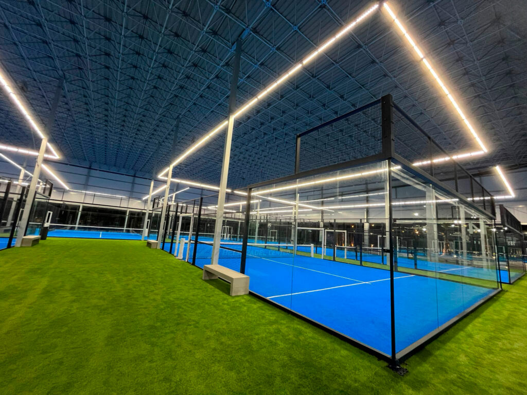 Primero, contamos con 9 pistas indoor. Estas pistas están configuradas con un sistema de luz perimetral que ofrece una iluminación uniforme y regulable hasta los 1000 luxes. Este es el nivel requerido en torneos profesionales televisados. Genera un consumo hasta un 70% menor que sistemas convencionales.